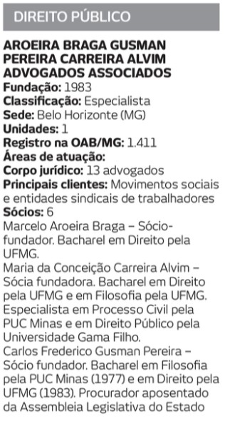 O Escritório Aroeira Braga, Gusman Pereira, Carreira Alvim e Advogados Associados foi eleito pela Revista Encontro como uma empresa referência na área de Direito Público em Minas Gerais.